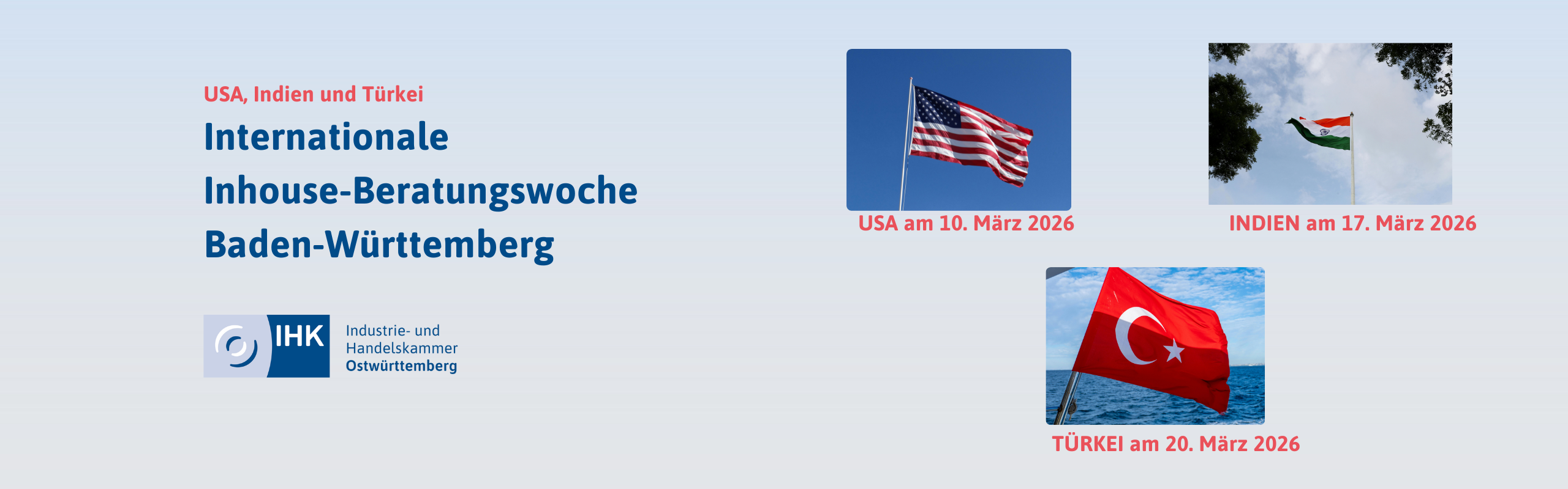 Die baden-württembergischen IHKs bieten Ihnen im Rahmen der Internationalen Beratungswochen 2026 individuelle Beratungen mit Expertinnen und Experten der Auslandshandelskammern (AHKs) an.